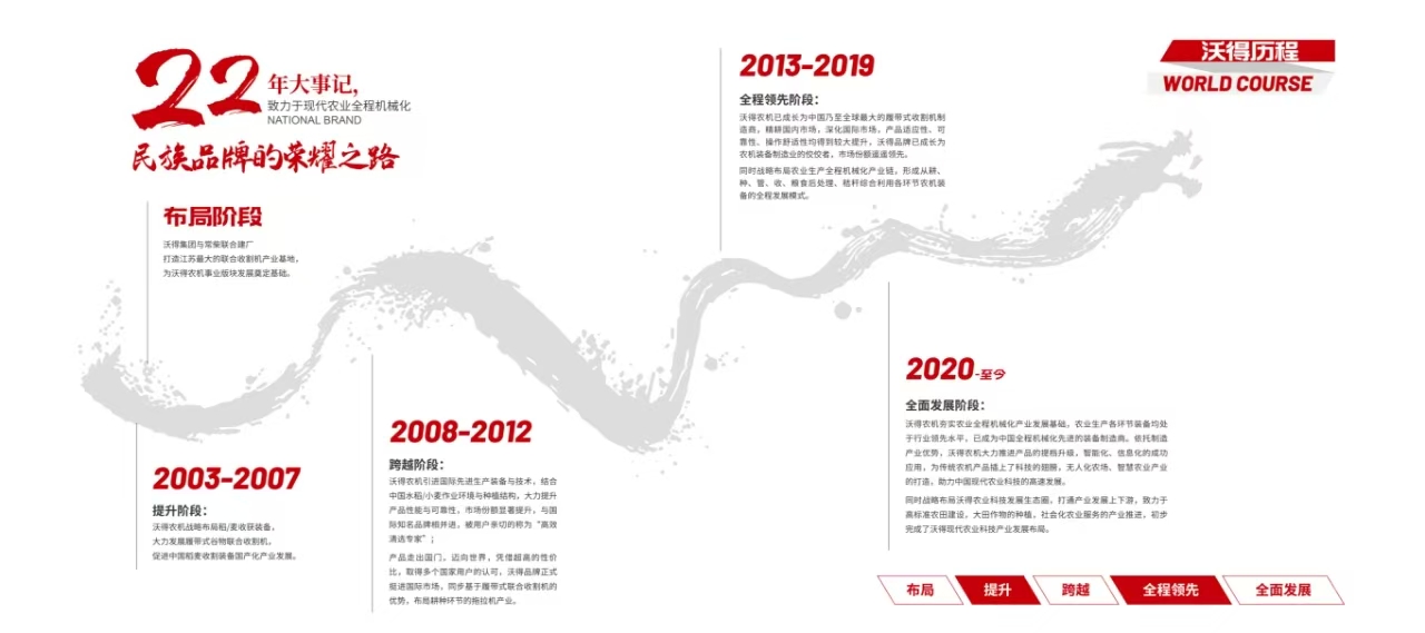 沃得農(nóng)機(jī)隸屬于中國民營企業(yè)500強(qiáng)之一的江蘇沃得集團(tuán),占地面積3000余畝,員工8000余人,2016年實(shí)現(xiàn)銷售70億元人民幣,是一家集研發(fā)、生產(chǎn)、銷售、服務(wù)于一體的大型現(xiàn)代化農(nóng)機(jī)裝備制造企業(yè)。沃得農(nóng)機(jī)立足水田,致力于現(xiàn)代農(nóng)業(yè)全程機(jī)械化,歷經(jīng)近30年發(fā)展,產(chǎn)品形成以耕-種-田間管理-收獲-秸稈綜合利用-糧食后處理全系列產(chǎn)品線。依托優(yōu)質(zhì)的產(chǎn)品和誠信的服務(wù),公司產(chǎn)品暢銷全國28個(gè)省市自治區(qū),出口至世界38個(gè)國家和地區(qū)。